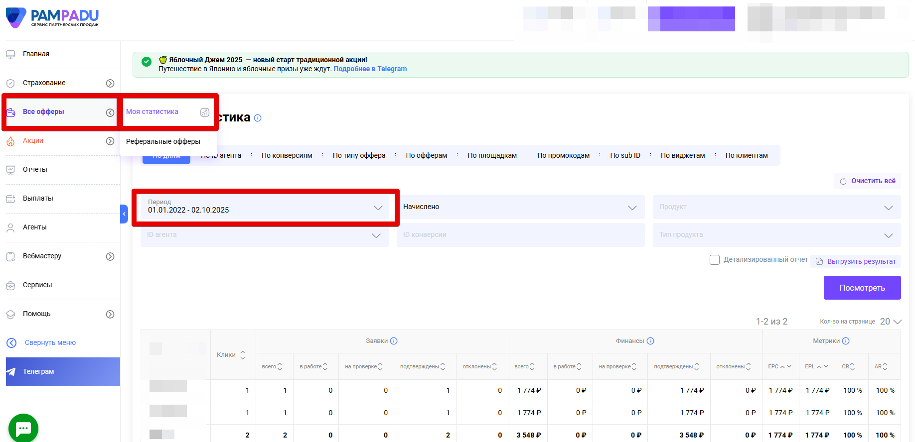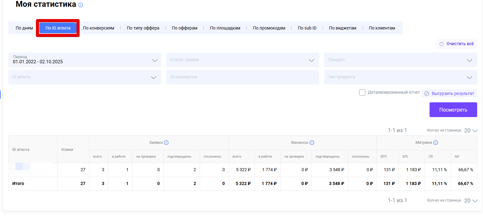 Инструмент «Моя статистика» создан именно для этого — он позволяет агентам видеть подробные данные по каждому офферу и каждой заявке, выявлять наиболее прибыльные источники трафика и отслеживать эффективность своих рекламных кампаний.