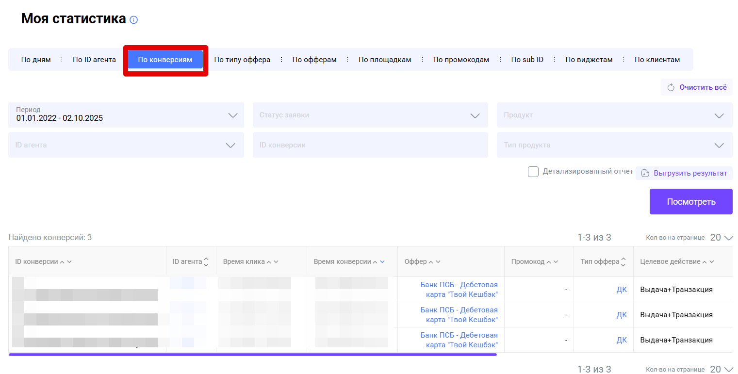 - По конверсиям - в данном срезе учитываются все созданные агентами конверсии. Каждая конверсия имеет свой ID, принадлежность к продукту и категории, время конверсии и актуальный статус. Данный отчет позволит более эффективно общаться с технической поддержкой и банками, а также видеть актуальный статус по каждой из конверсий.