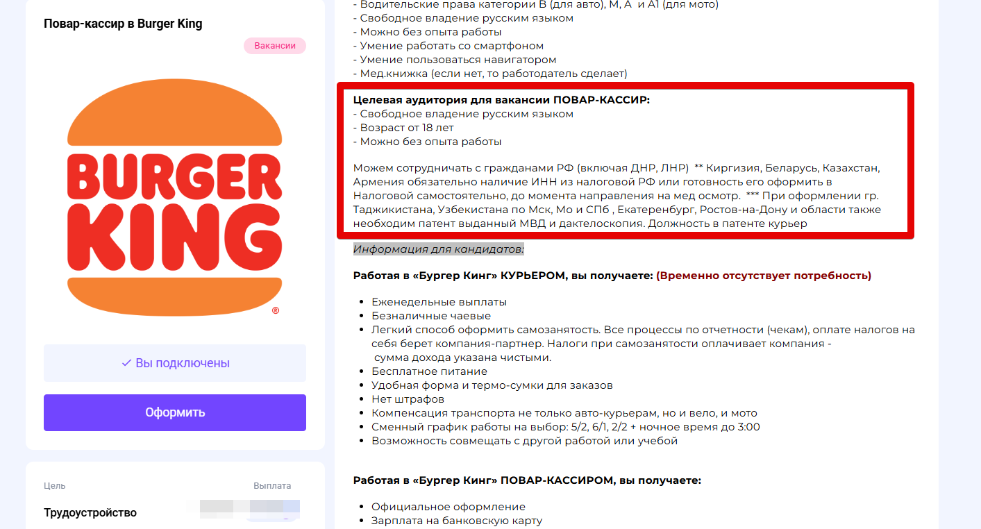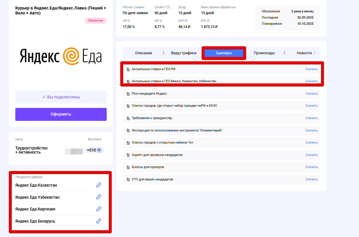 Однако есть и HR-офферы, где набор кандидатов проводится не только в города России. Так, по офферу «Курьер в Яндекс.Еда / Яндекс.Лавка (пеший, велосипед, авто)» можно приглашать лидов в Республику Казахстан, Беларусь, Узбекистан и Киргизию.