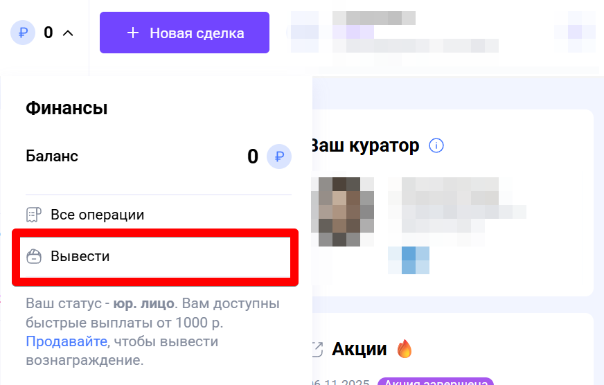 В течение нескольких минут после успешного подписания оферты вам станет доступен вывод средств. Обновите страницу, нажмите на ваш баланс в верхней части экрана и выберите кнопку «Вывести».