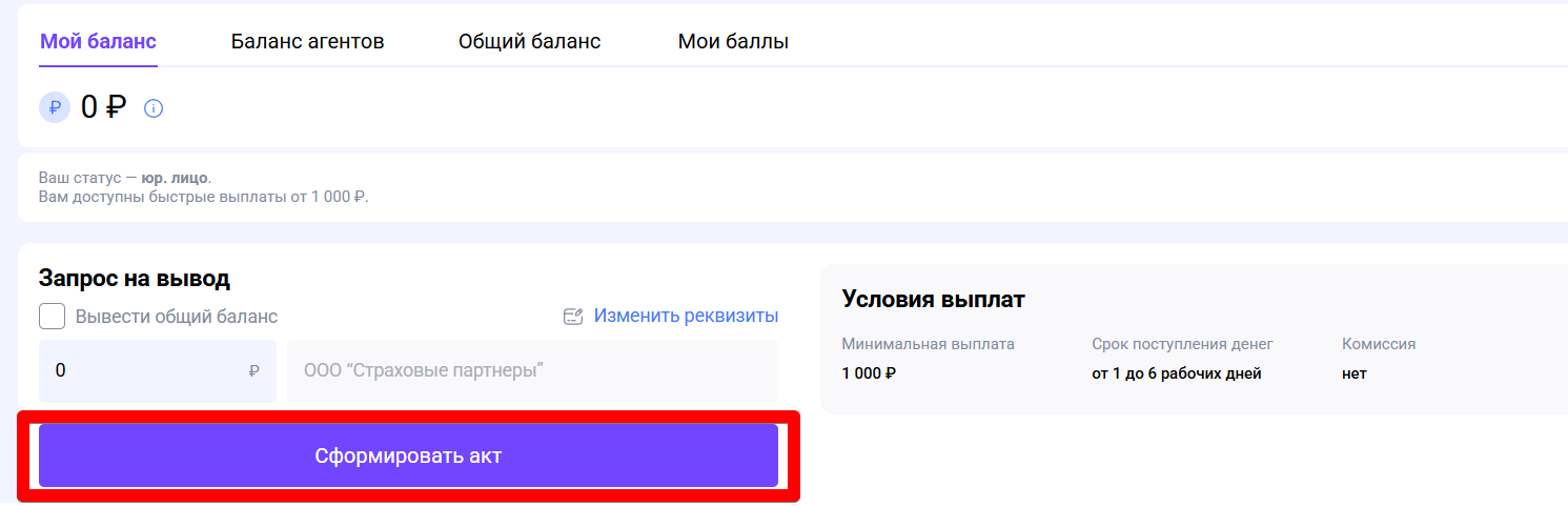 На странице вывода укажите сумму, которая спишется с баланса и попадёт в акт, либо выберите опцию «Вывести общий баланс». Перед тем как формировать акт на выплату, обязательно проверьте реквизиты в личном кабинете, затем нажмите «Сформировать акт».