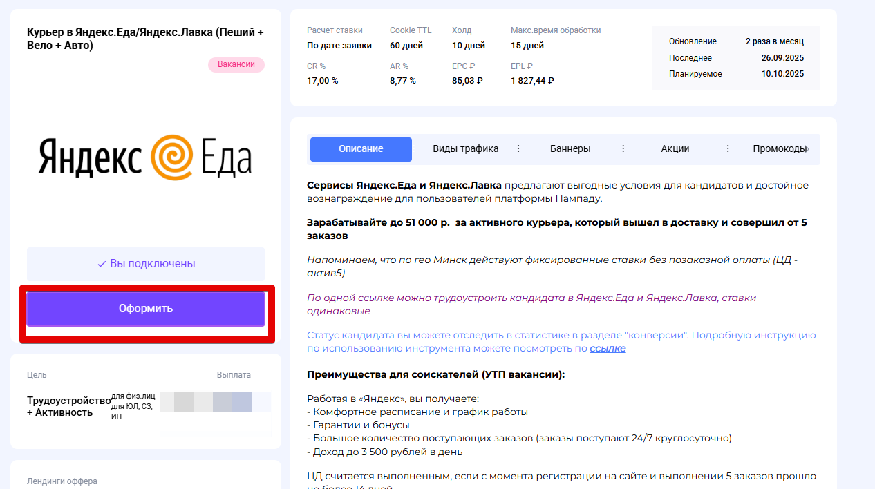 Распространённая ошибка — агент нажимает кнопку «Оформить» в личном кабинете, попадает на страницу рекламодателя и копирует ссылку из адресной строки браузера. Такая ссылка не подходит для передачи кандидатам, поскольку не содержит вашего уникального идентификатора.
