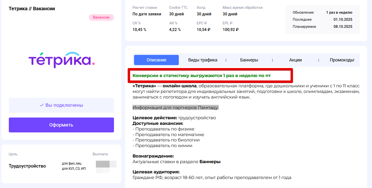 Проверить актуальные данные можно в разделе «Моя статистика» платформы Пампаду — там отображаются все заявки и статусы по вашим вакансиям. Если конверсии появляются с задержкой, это может быть связано именно с особенностями интеграции бренда.