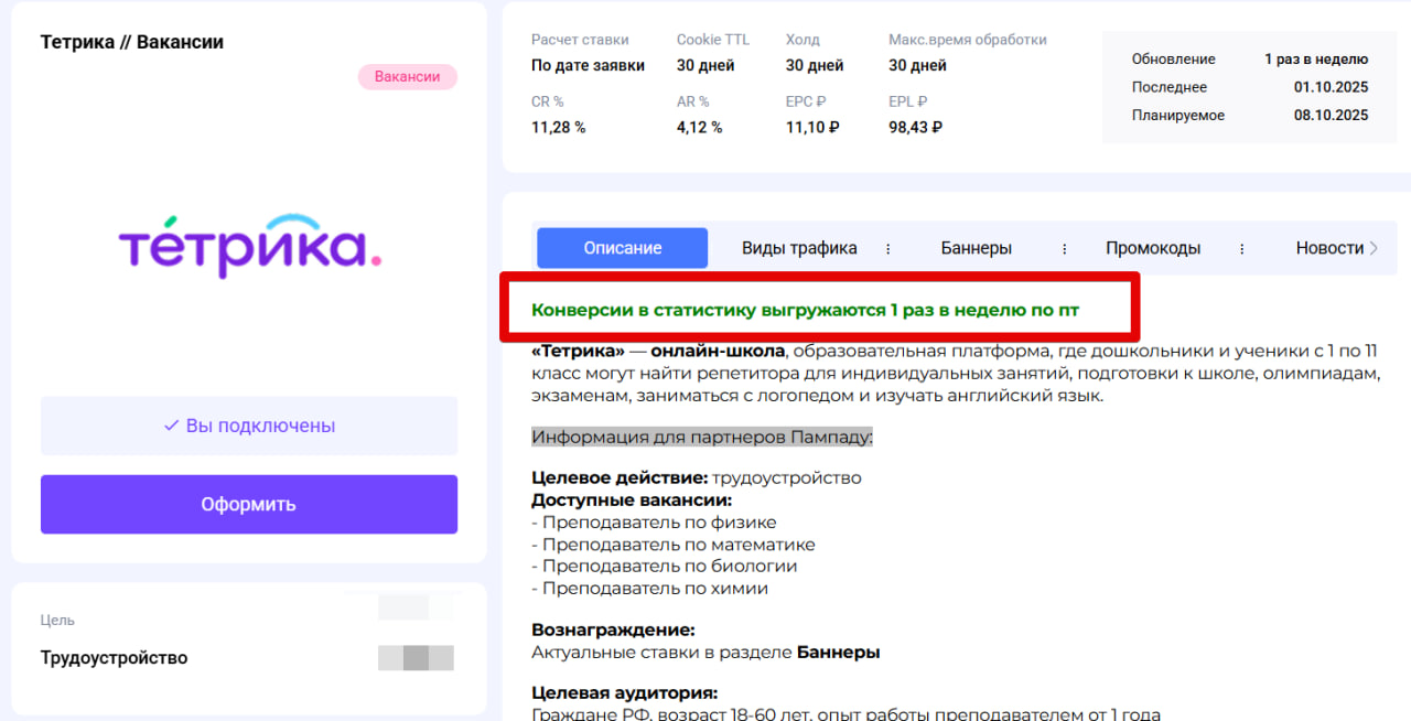 Обратите внимание, что есть офферы, где выгрузка заявок в статус «В работе» происходит в ручном формате по определённым дням. Так, к примеру, по офферу Тетрика // Вакансии выгрузка заявок в этот статус осуществляется раз в неделю, в определённый день — а именно в пятницу. Поэтому, если вы сделали заявку в среду и она ещё не отображается, не стоит переживать — необходимо дождаться выгрузки вашей заявки.