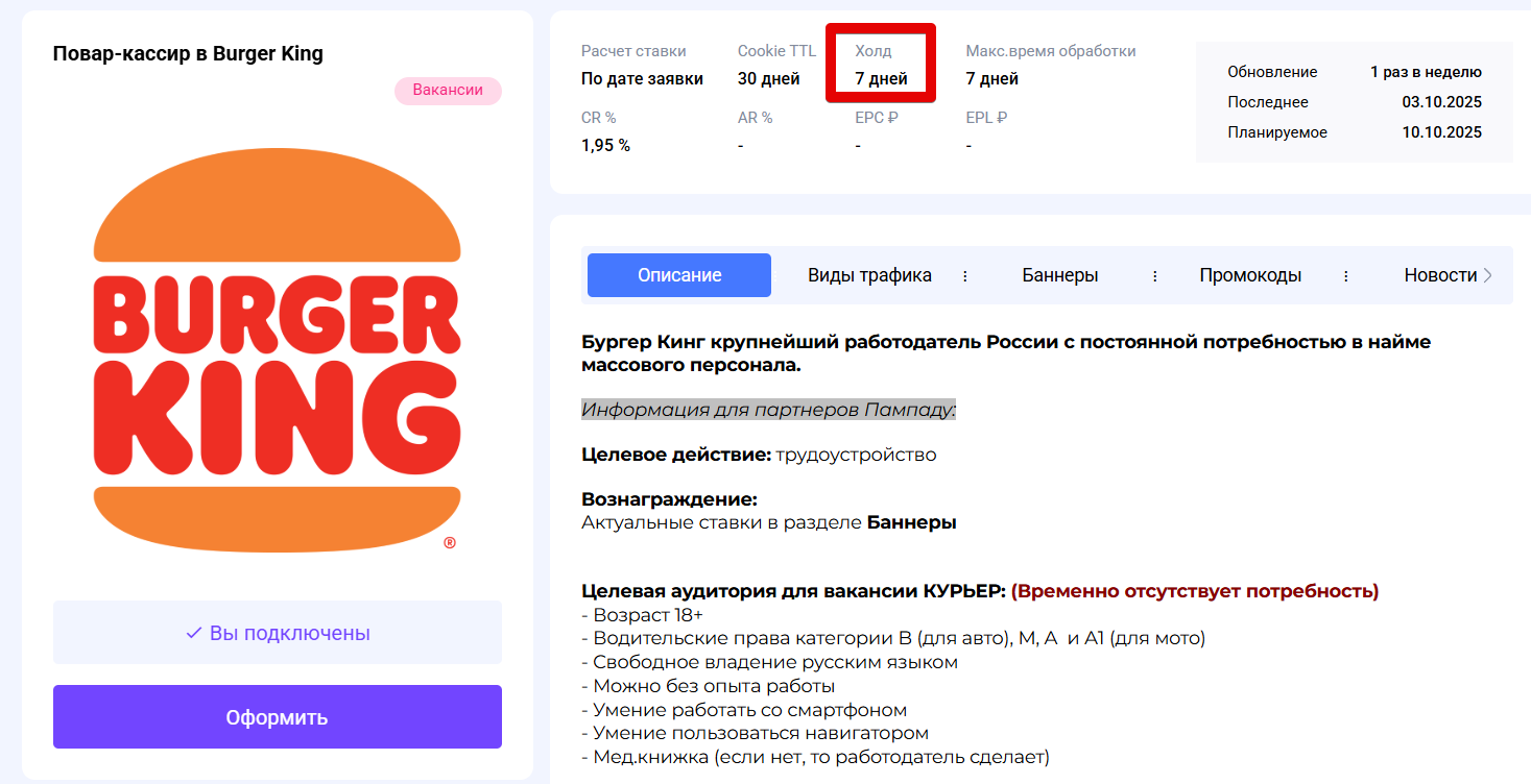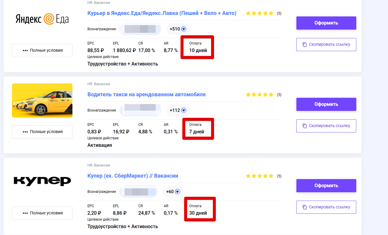 Выплата происходит только после подтверждения рекламодателем целевого действия — то есть, когда кандидат действительно вышел на работу или выполнил другие условия, указанные в оффере. Срок выплаты также указан в карточке оффера — нужно смотреть параметр «Оплата».