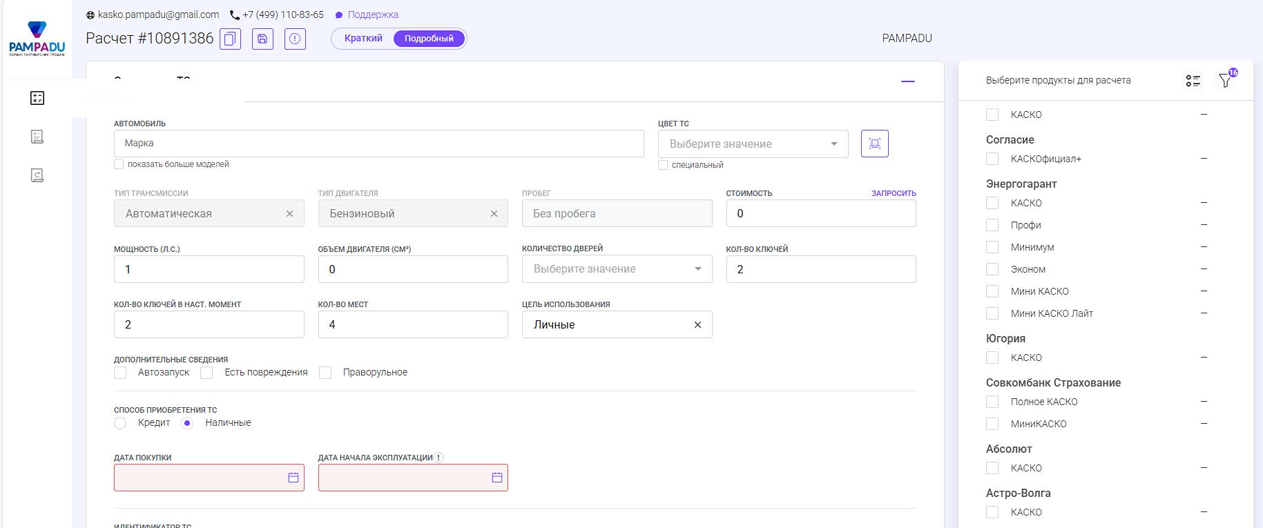 После этого в новом окне откроется страница личного кабинета по оформлению КАСКО. Изначально расчёт будет пустым. Заполненные поля имеют значения по умолчанию.