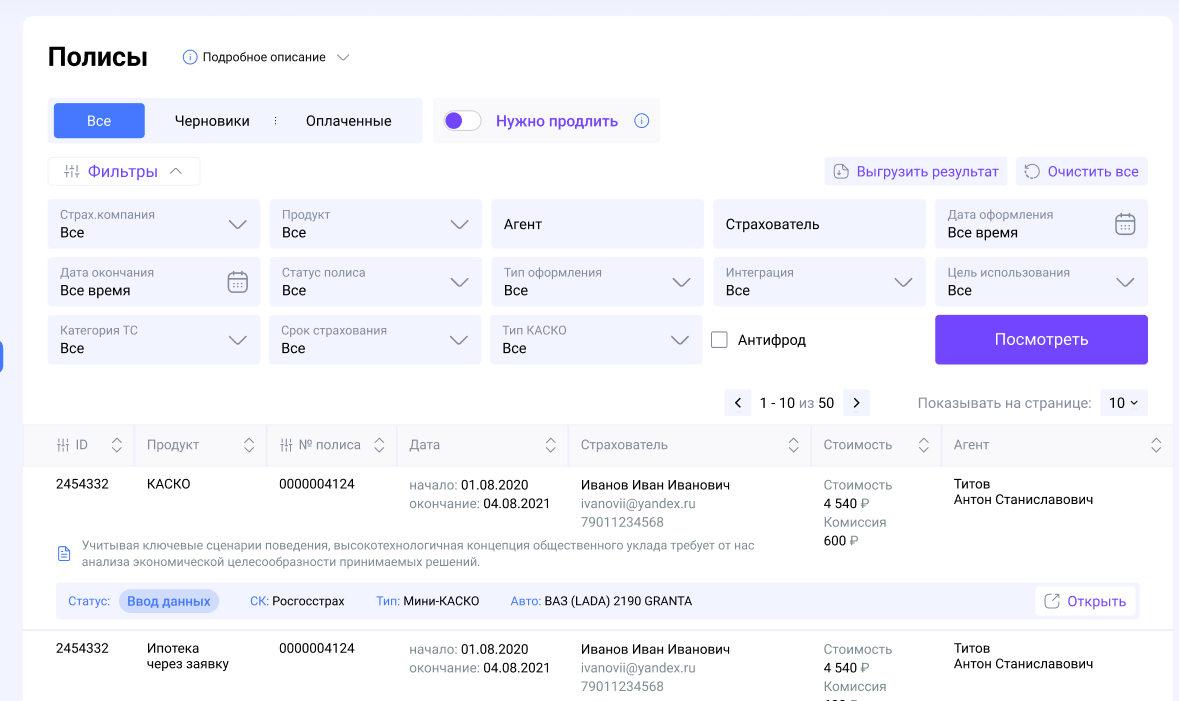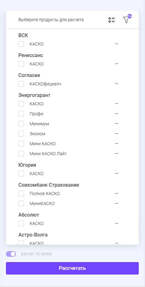 В правой части экрана представлены все доступные программы и страховые компании. Вы можете отфильтровать необходимые.