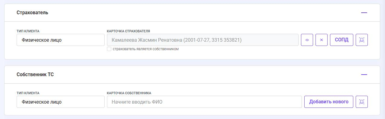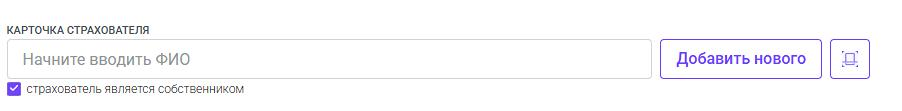 Если собственник и страхователь — разные лица, снимите галочку с чекбокса «Страхователь является собственником». Откроется дополнительное поле для заполнения.