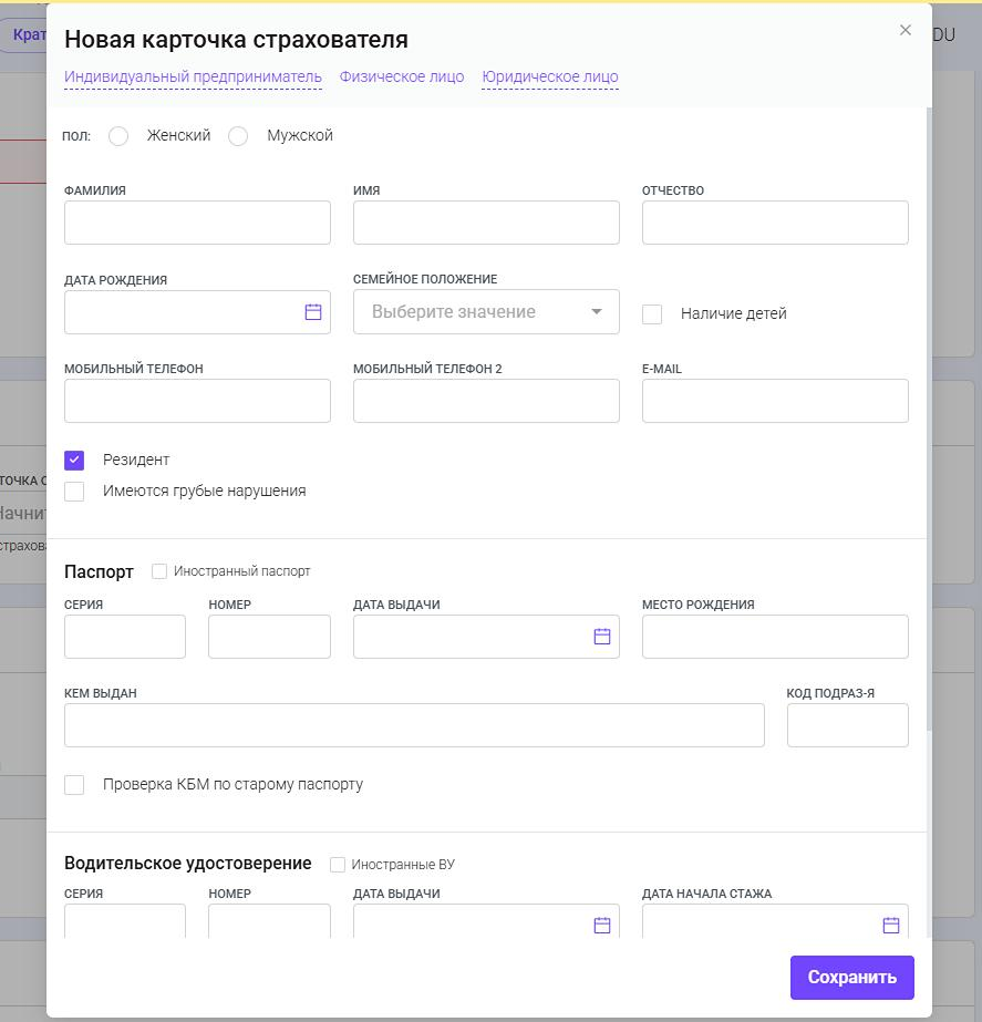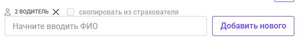 При указании водителей вы можете скопировать данные страхователя, поставив чекбокс «Скопировать из страхователя». Чтобы удалить скопированные данные, нажмите на крестик рядом с карточкой.