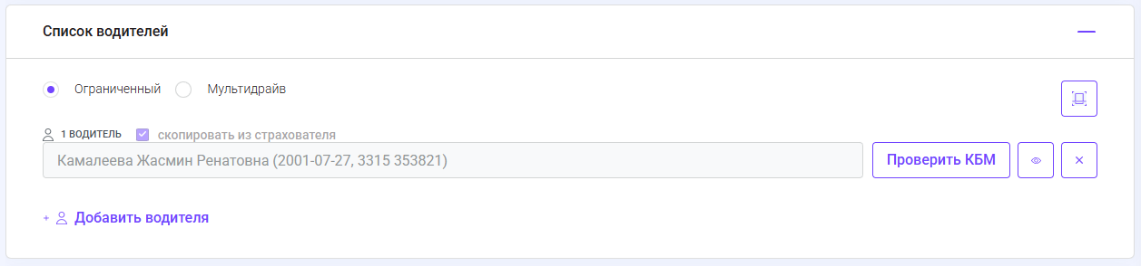 Доступны два варианта: указание конкретных водителей или мультидрайв (полис без ограничений по водителям).