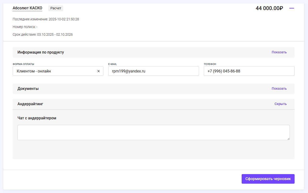 Если кнопки «Отправить на андеррайтинг» нет, сначала нажмите «Сформировать черновик».