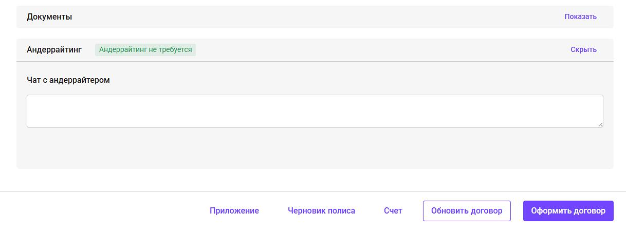 После формирования договора появятся дополнительные кнопки. Также будет указано, требуется ли андеррайтинг (проверка документов).