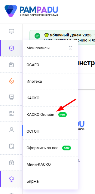 Для оформления самостоятельного КАСКО необходимо открыть в левом меню вкладку «Страхование» и выбрать «КАСКО Онлайн New».