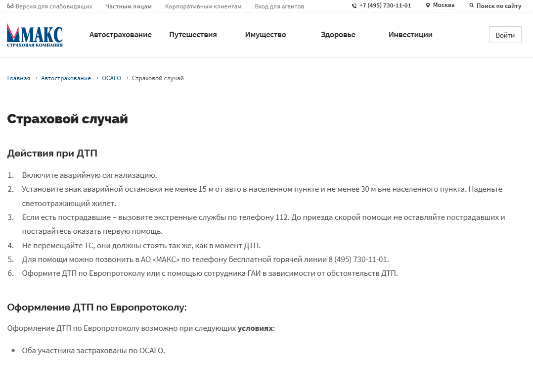 Подробная инструкция о действиях при ДТП размещена на официальном сайте компании МАКС: https://makc.ru/avtostrakhovanie/osago/strakhovoy-sluchay-osago.php.