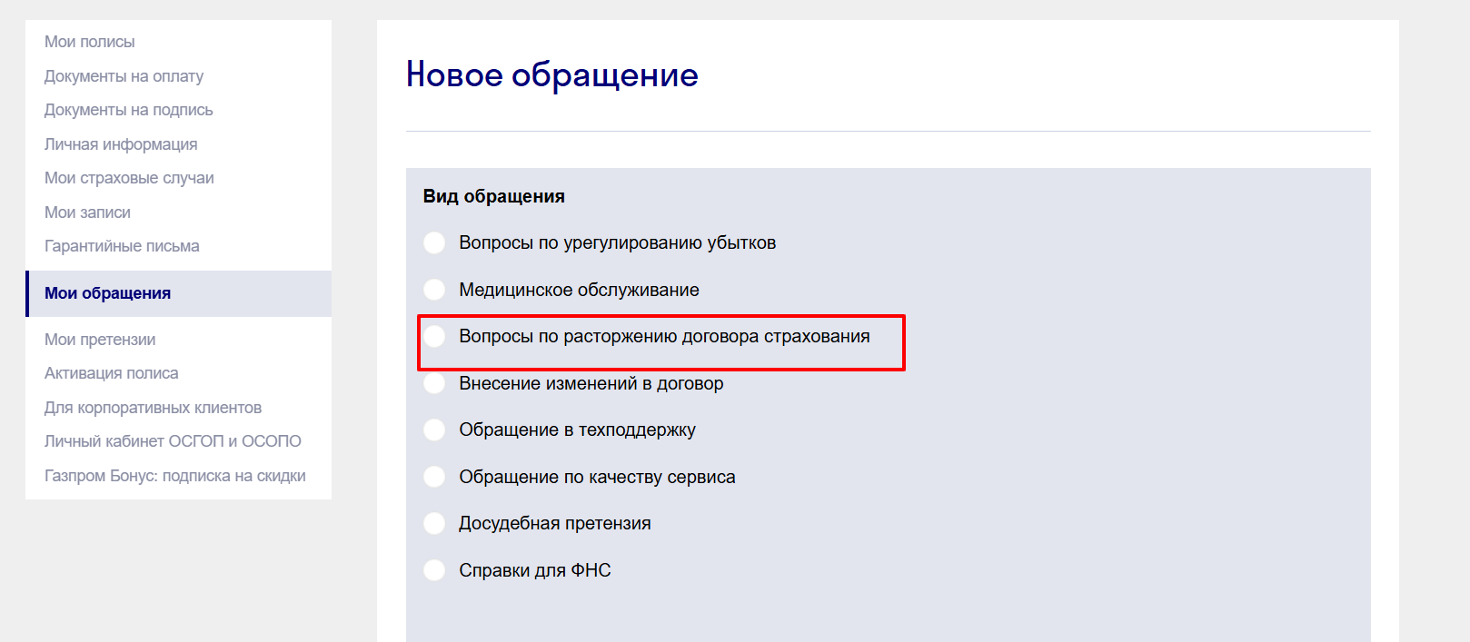 Полис можно расторгнуть в офисе страховой компании или на сайте в личном кабинете. Для этого необходимо создать обращение в разделе «Вопросы по расторжению договора страхования».