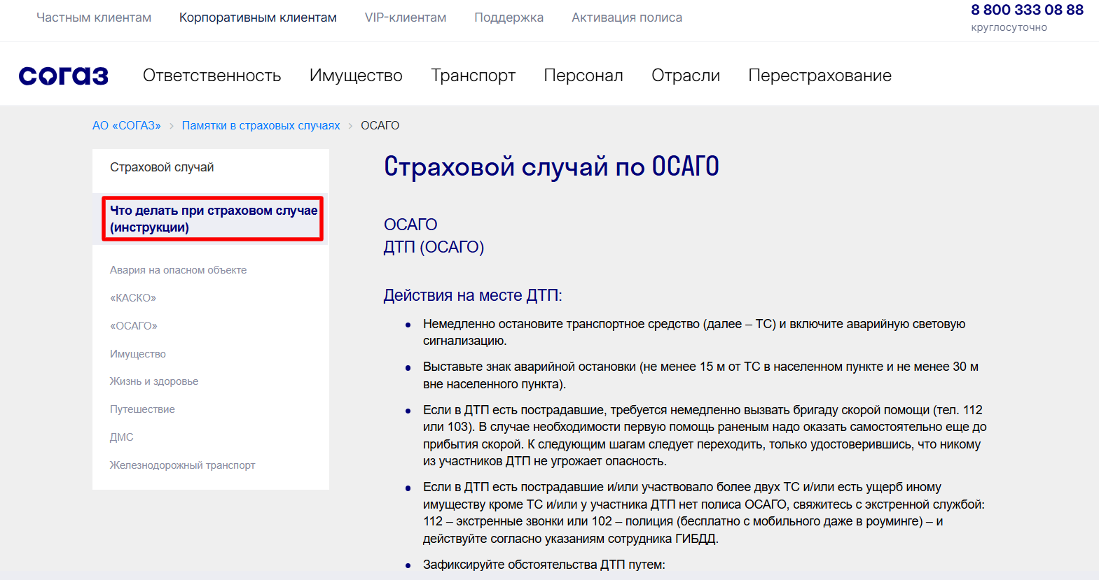 Подробная информация о действиях при ДТП доступна на сайте страховой компании по ссылке: https://www.sogaz.ru/claim/osago/.