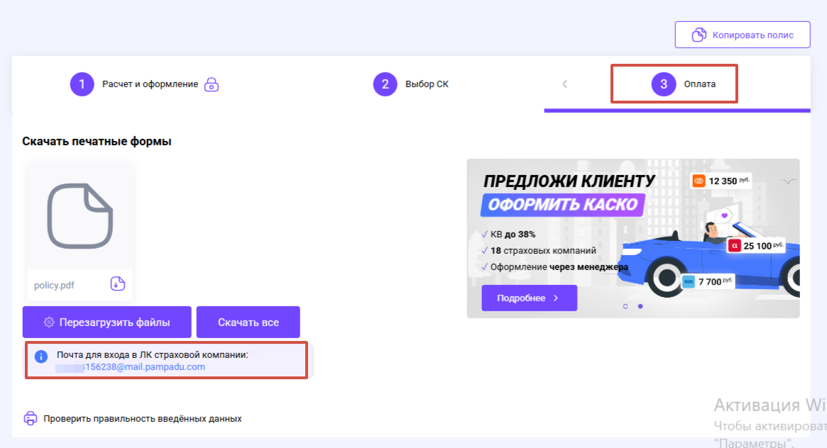 Логином для входа в личный кабинет на сайте является электронная почта, сгенерированная на 3-м шаге оплаты полиса.