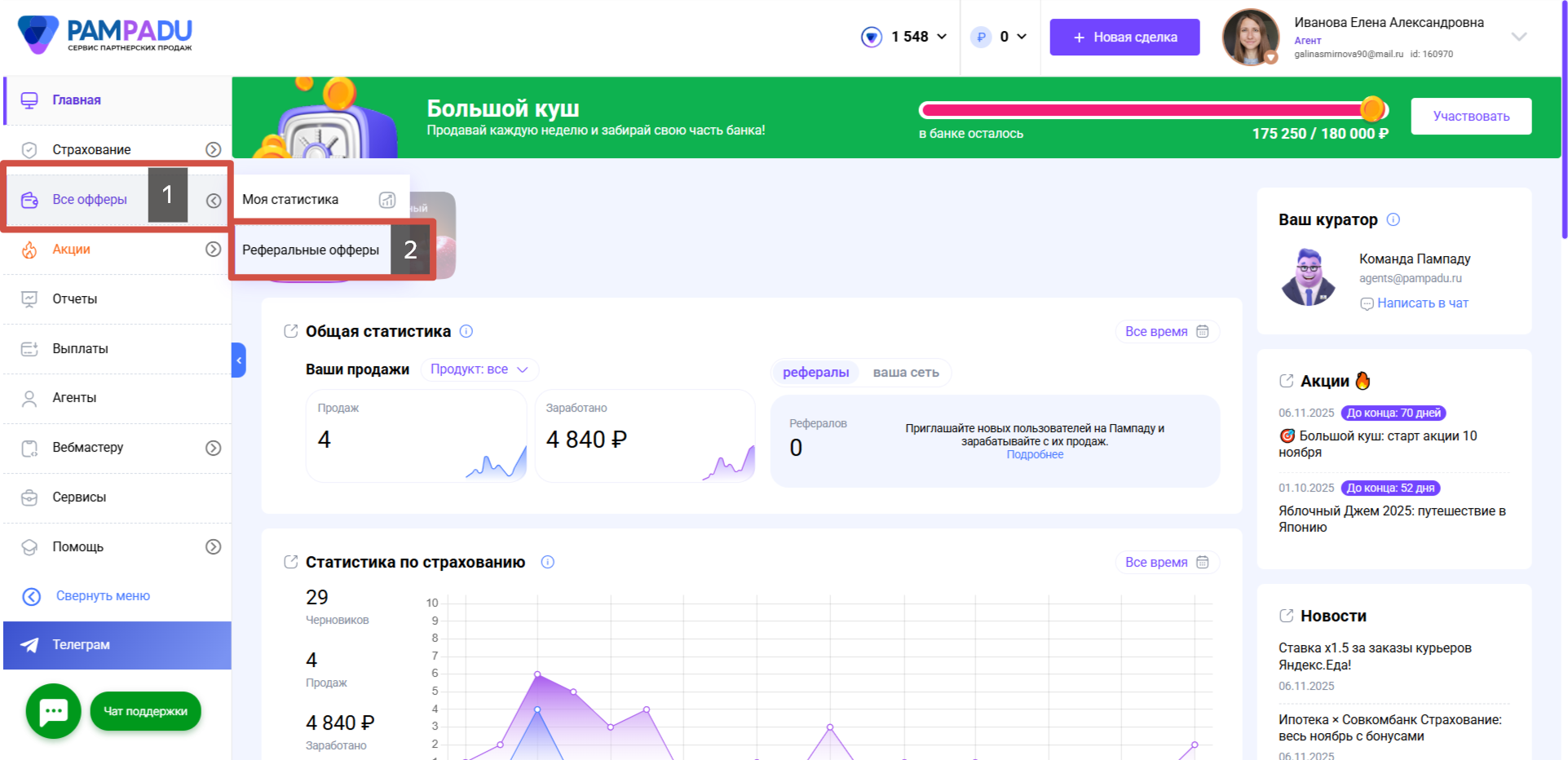 Всё находится прямо в вашем личном кабинете Пампаду: