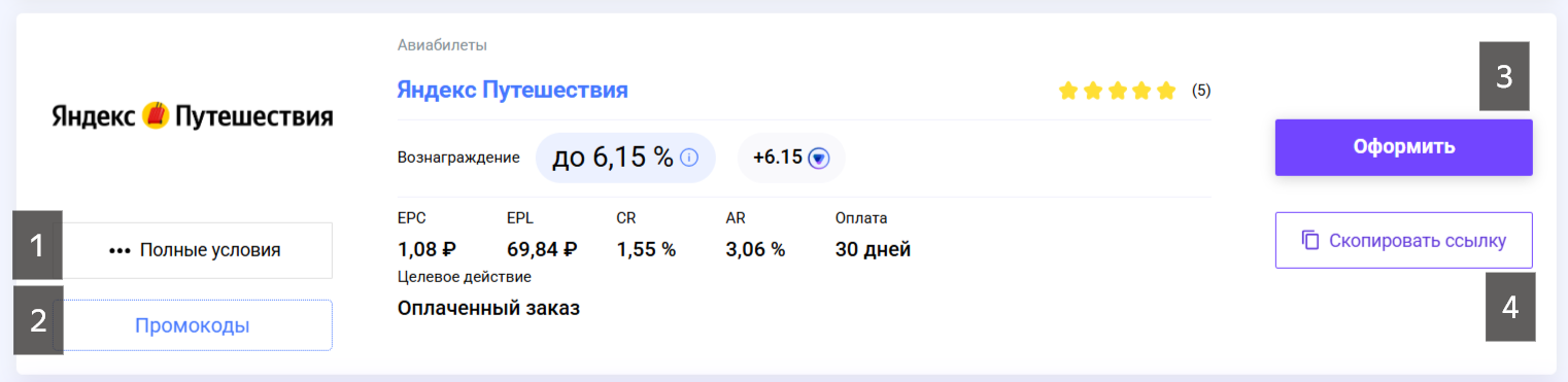 3. Кнопка «Оформить» (3) — при нажатии вы либо создаёте персональную ссылку для клиента, чтобы отслеживать его заявку через раздел «Моя статистика», либо переходите напрямую на сайт рекламодателя по своей реферальной ссылке. Это удобно, если вы оформляете заявку за клиента самостоятельно.
