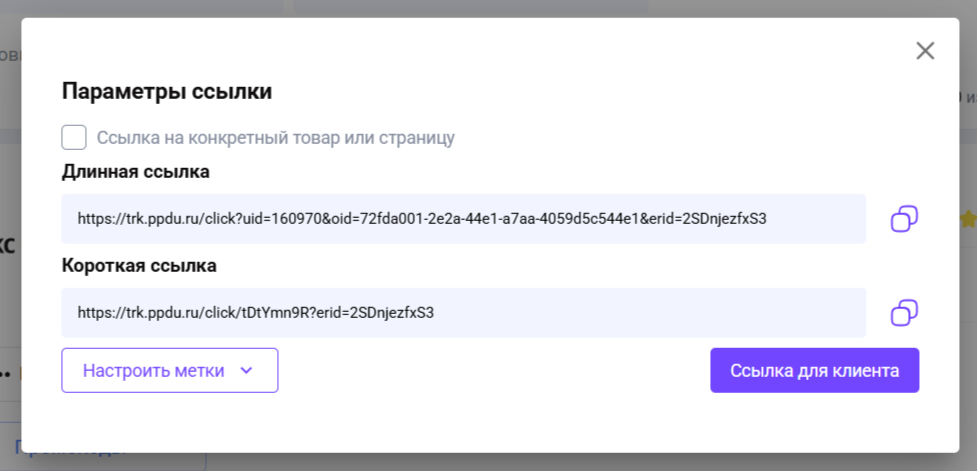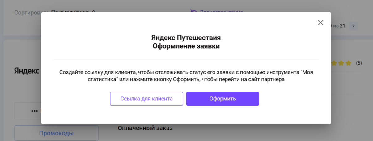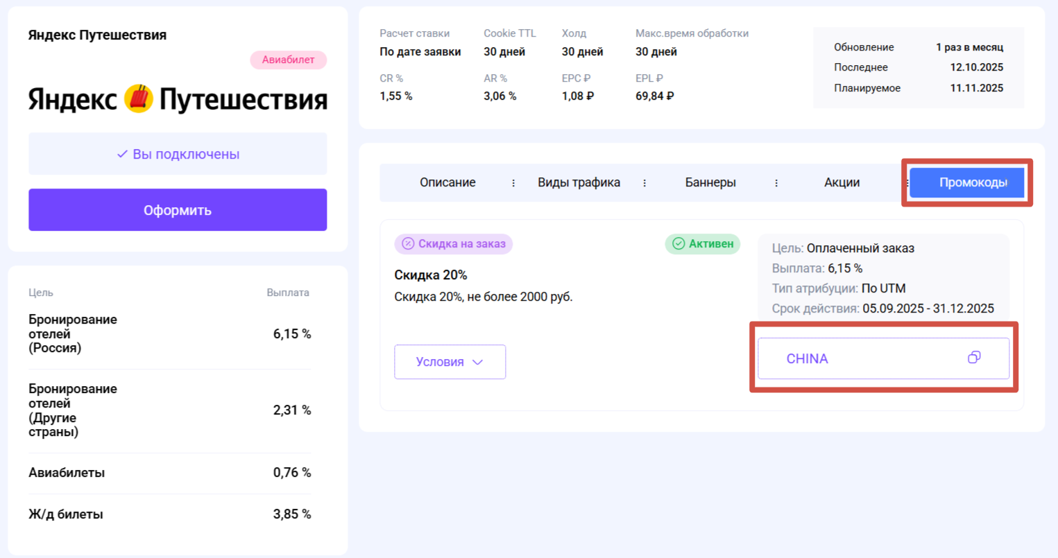 2. Промокоды (2) — если к офферу прикреплён промокод, вы увидите его отдельной вкладкой. Достаточно нажать «Скопировать», и промокод готов к отправке клиенту вместе со ссылкой.
