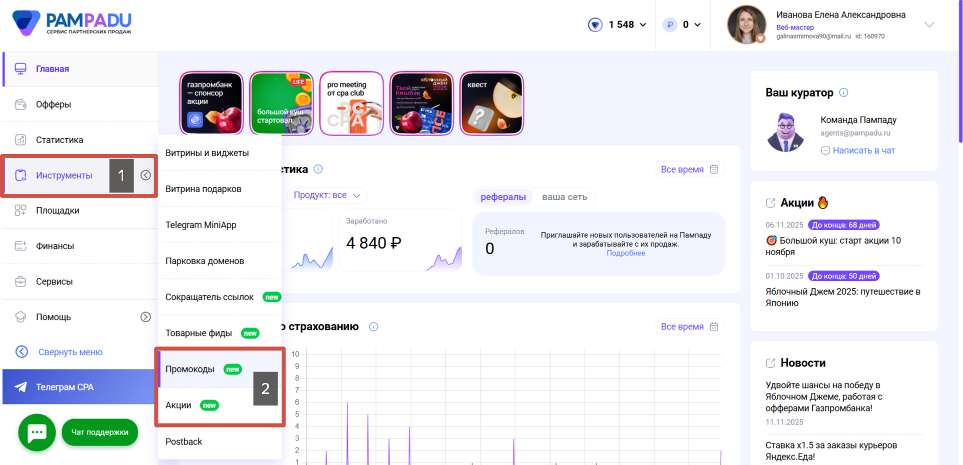 Чтобы перейти в раздел, откройте боковое меню слева, выберите «Инструменты» (1) и нажмите «Промокоды» (2). На экране отобразятся все активные промокоды, доступные на платформе. Что можно делать: