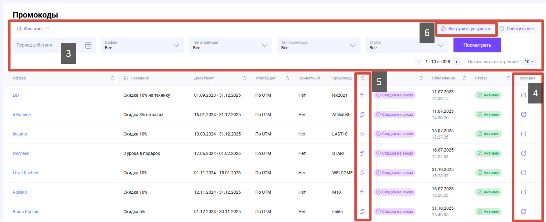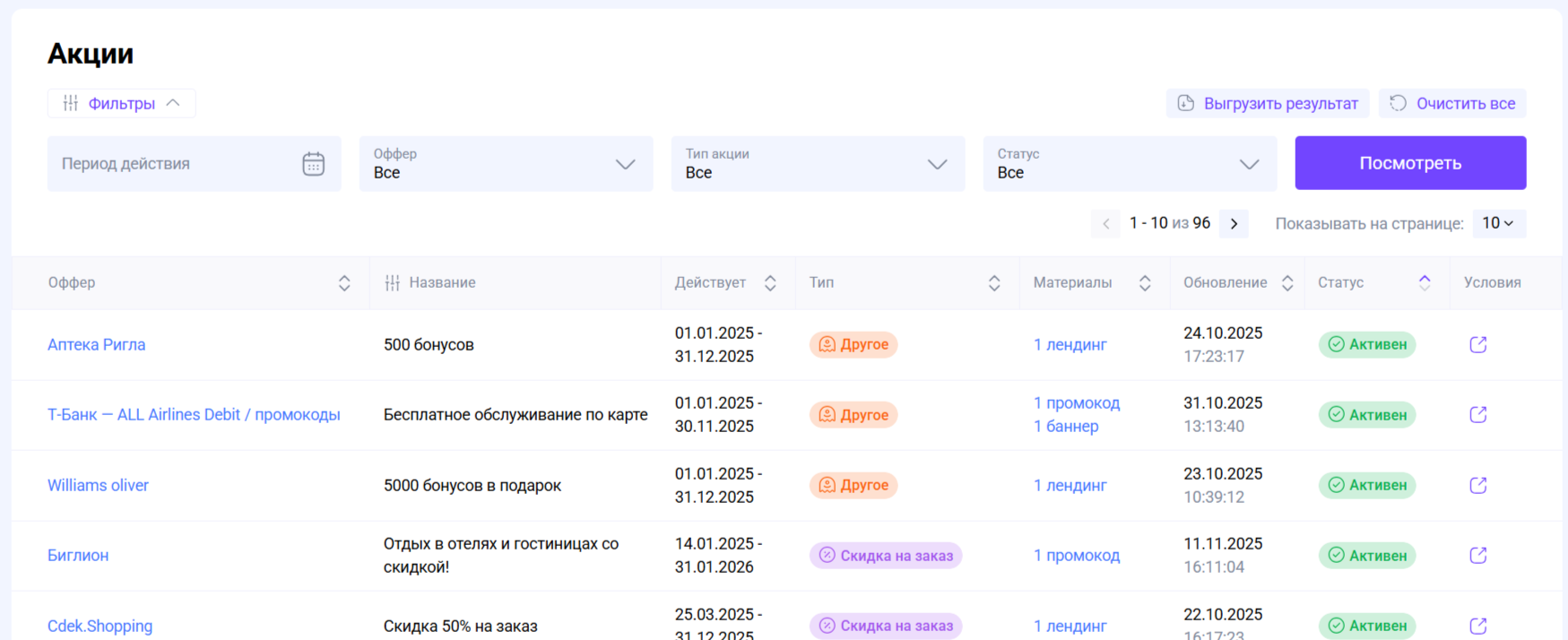 Фильтры помогут быстро найти подходящую акцию по периоду действия, офферу, типу или статусу. Указаны все детали: оффер, название, сроки действия, тип, рекламные материалы, дата обновления, статус и условия участия.