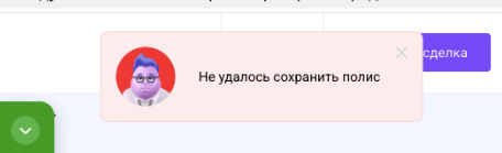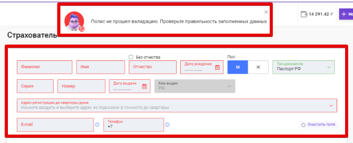 - Проверьте проставлена ли галочка внизу - Есть действующий полис - если проставлена, пропишите данные полиса, если их нет - уберите галочку.