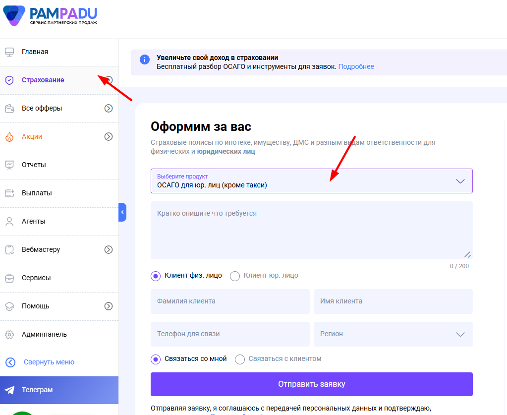2. Вы можете оформить полис для юр. лиц через менеджера, для этого Вам необходимо выбрать продукт "Страхование - Оформить за Вас". и отправить заявку на расчет через менеджера