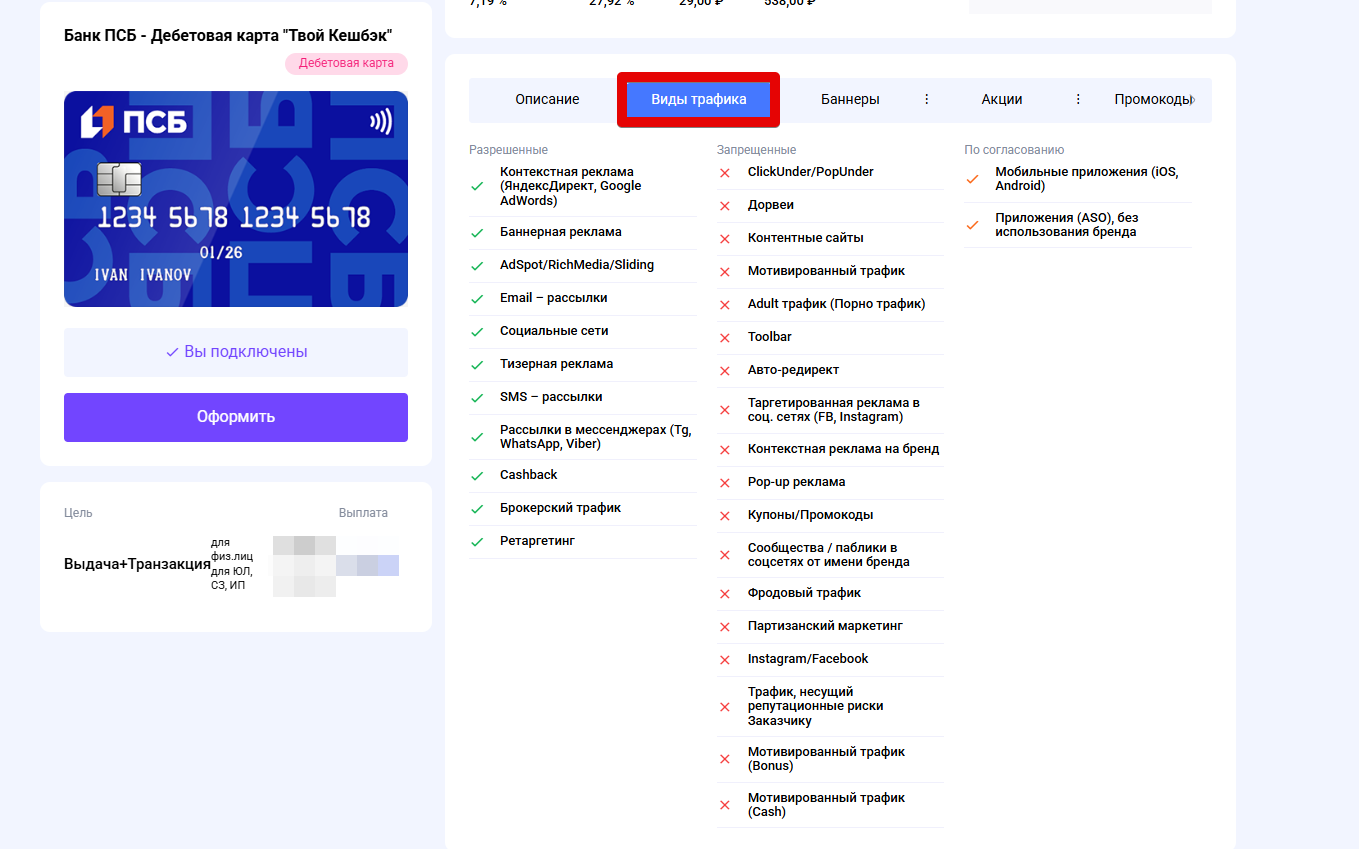- Банк может отказать в оплате или списать конверсии с партнёра за использование запрещённых видов трафика.