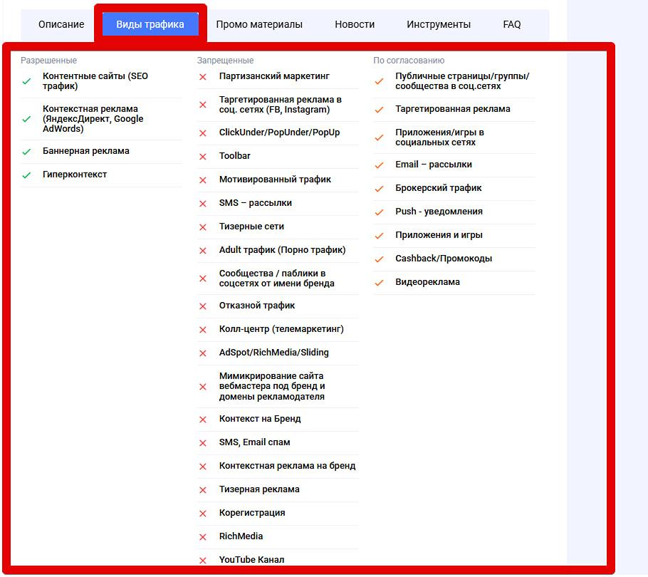 В каждом оффере указана информация о запрещённых и разрешённых видах трафика.
