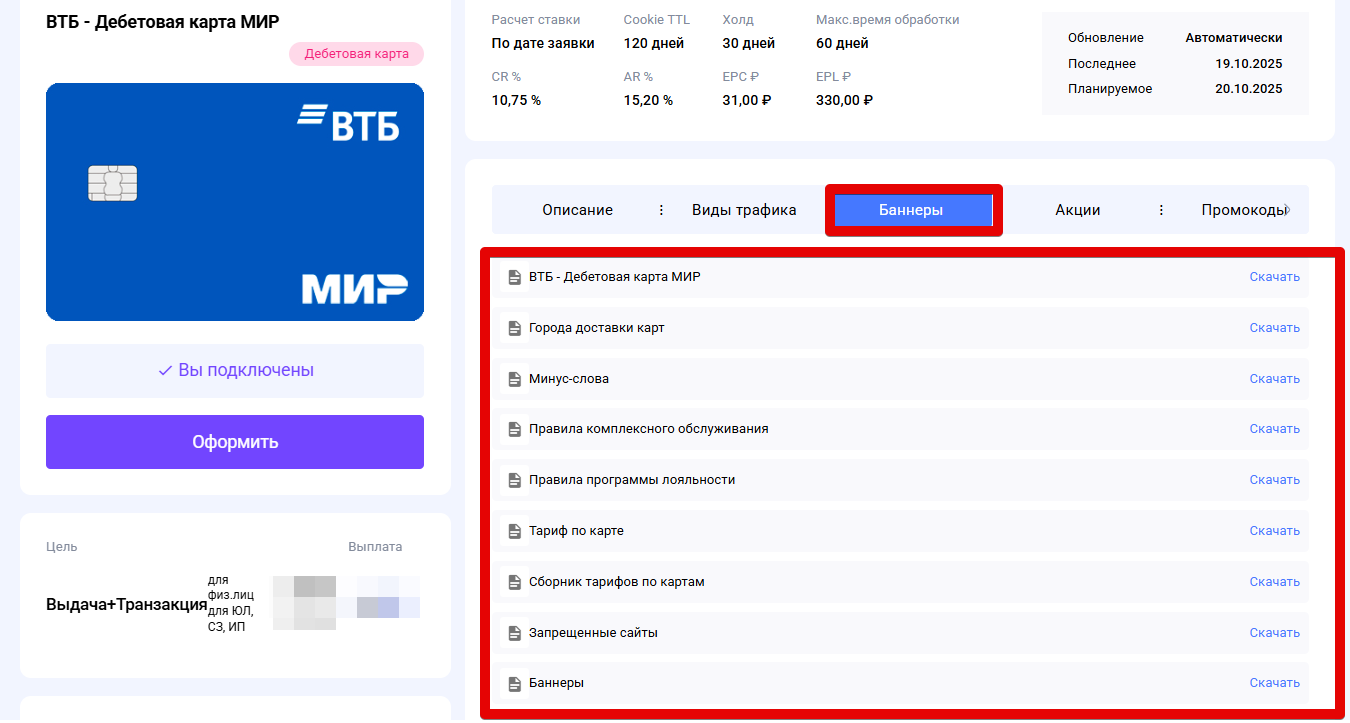 Кроме того, рекомендуется регулярно заглядывать в раздел «Баннеры» в карточке оффера. Там могут находиться полезные ресурсы — креативы, минус‑слова и другие материалы, которые помогут правильно выстроить рекламу и избежать нарушений правил при работе с оффером. Знание этих материалов особенно важно для обеспечения соответствия требованиям и максимально эффективного использования возможностей партнёрской программы.
