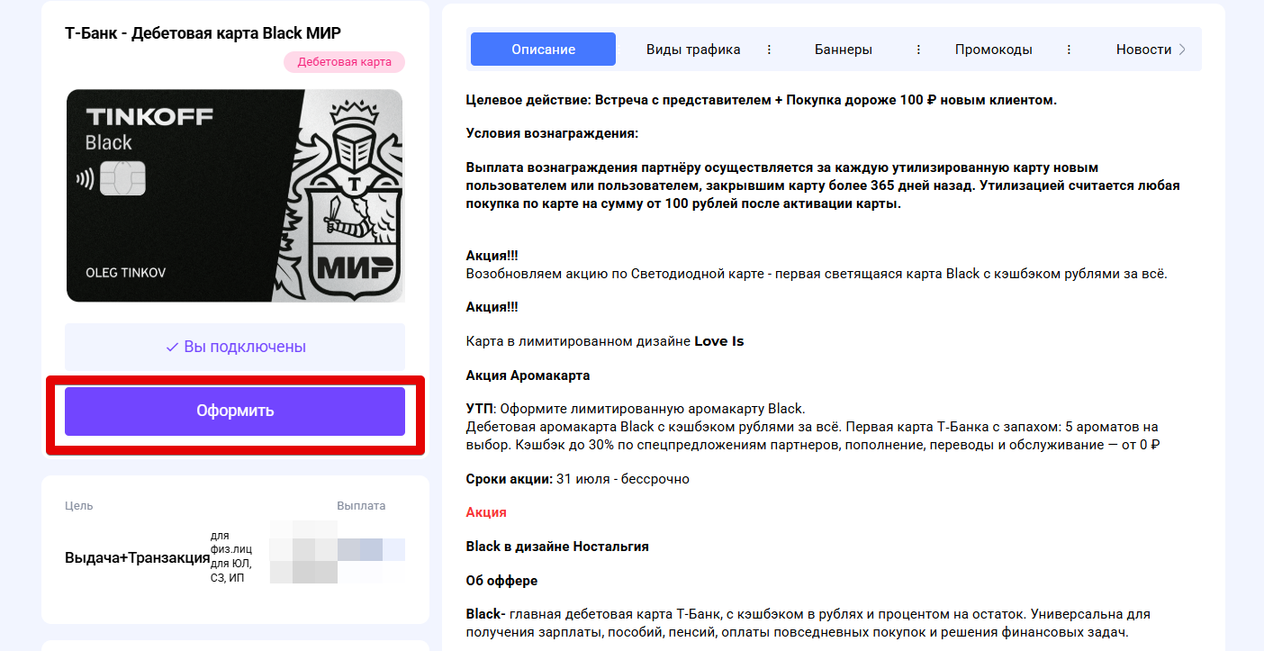 Для того чтобы подробно ознакомиться со всеми условиями оффера, включая ГЕО, целевое действие и иную полезную информацию, нужно нажать на карточку оффера. Так вы окажетесь на странице с полными условиями. Скопируйте ссылку, используя кнопку «Оформить».