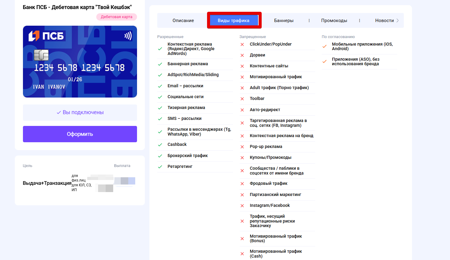 Полученную ссылку используйте для отправки своим клиентам в мессенджере или любым другим удобным способом. Главное — обратите внимание на раздел «Виды трафика» в оффере. Ваш способ продвижения не должен быть запрещён.